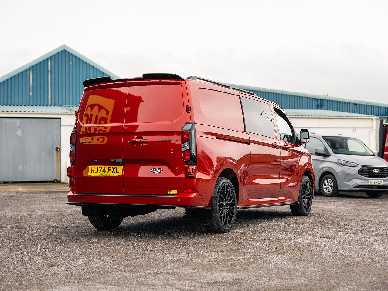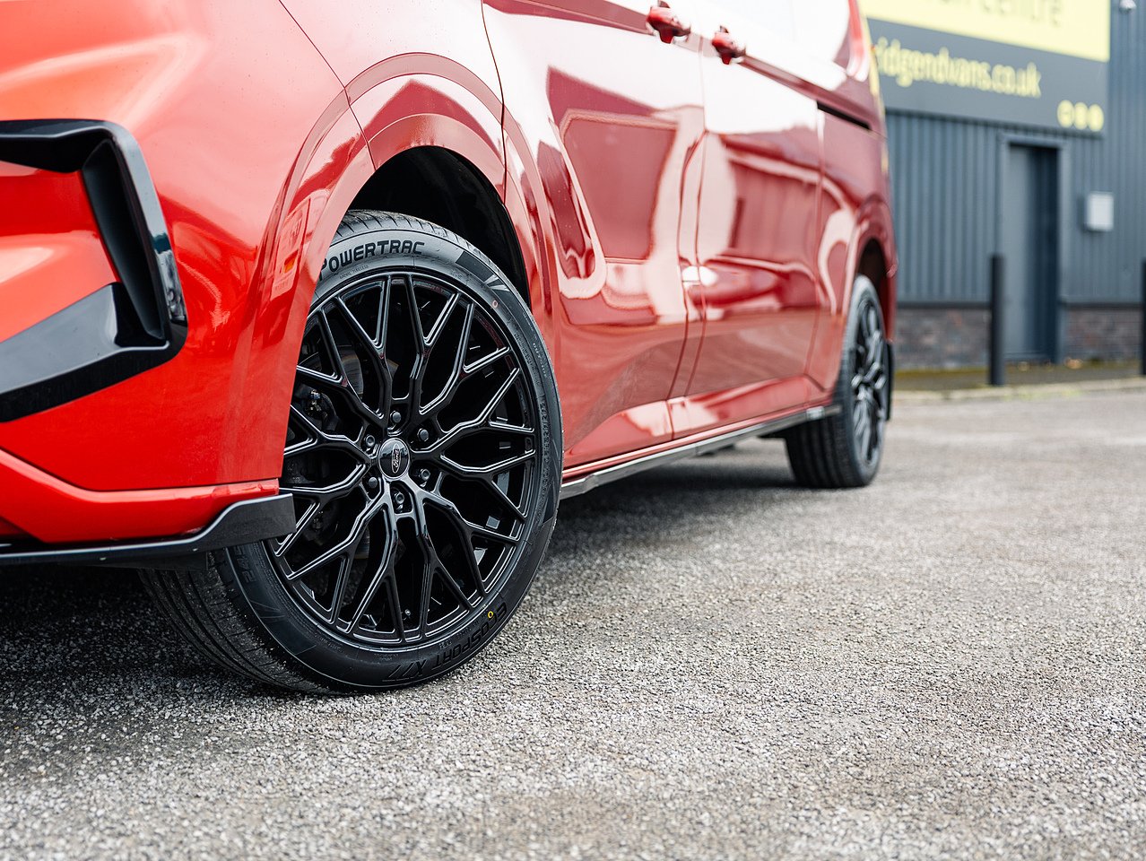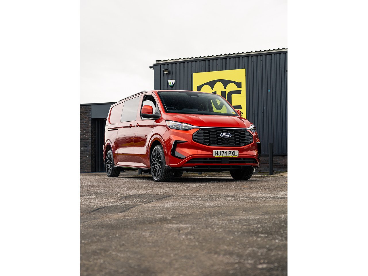 The exterior has been enhanced with a full styling kit including 20-inch gloss-black alloy wheels, a low-line aero kit with lower splitter, side skirts, rear spoiler and gloss-black front grille, giving this Transit Custom a premium, sporty look.