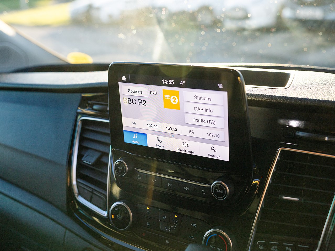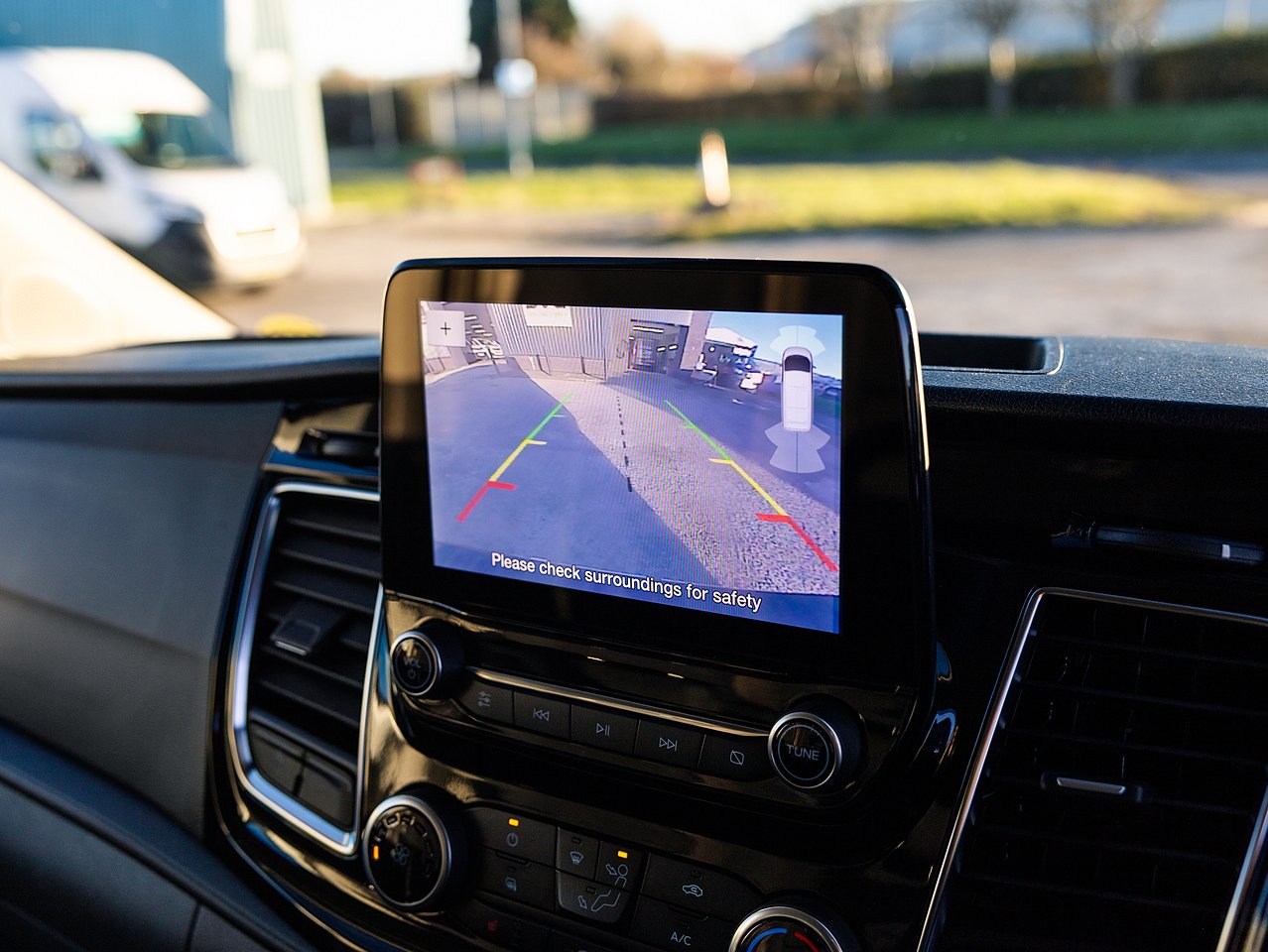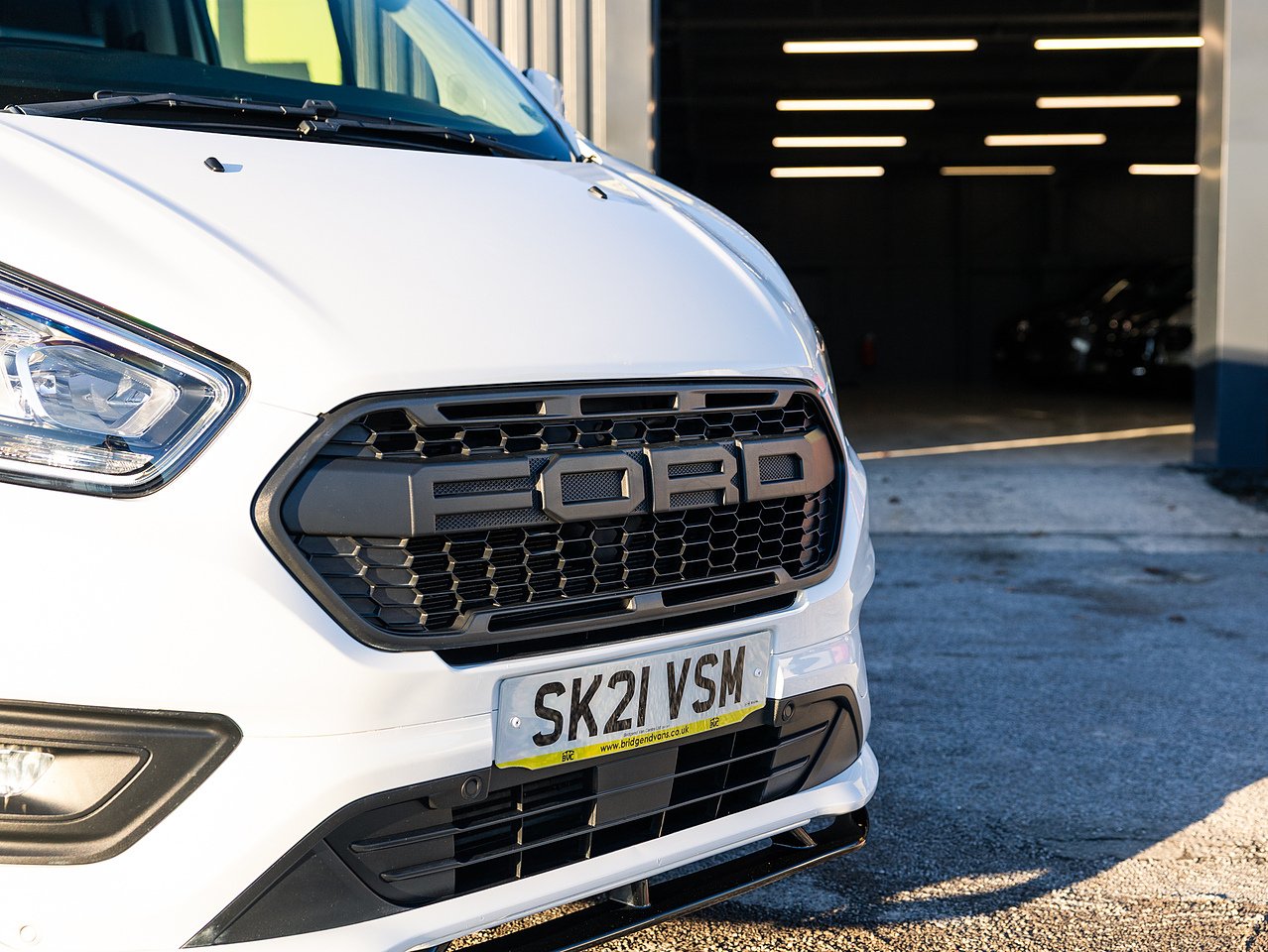 This Transit Custom is fitted with a full exterior styling package, including 18-inch alloy wheels, front splitter, Ford Trail front grille, rear spoiler, side bars and roof bars, giving it a distinctive and well-finished appearance.