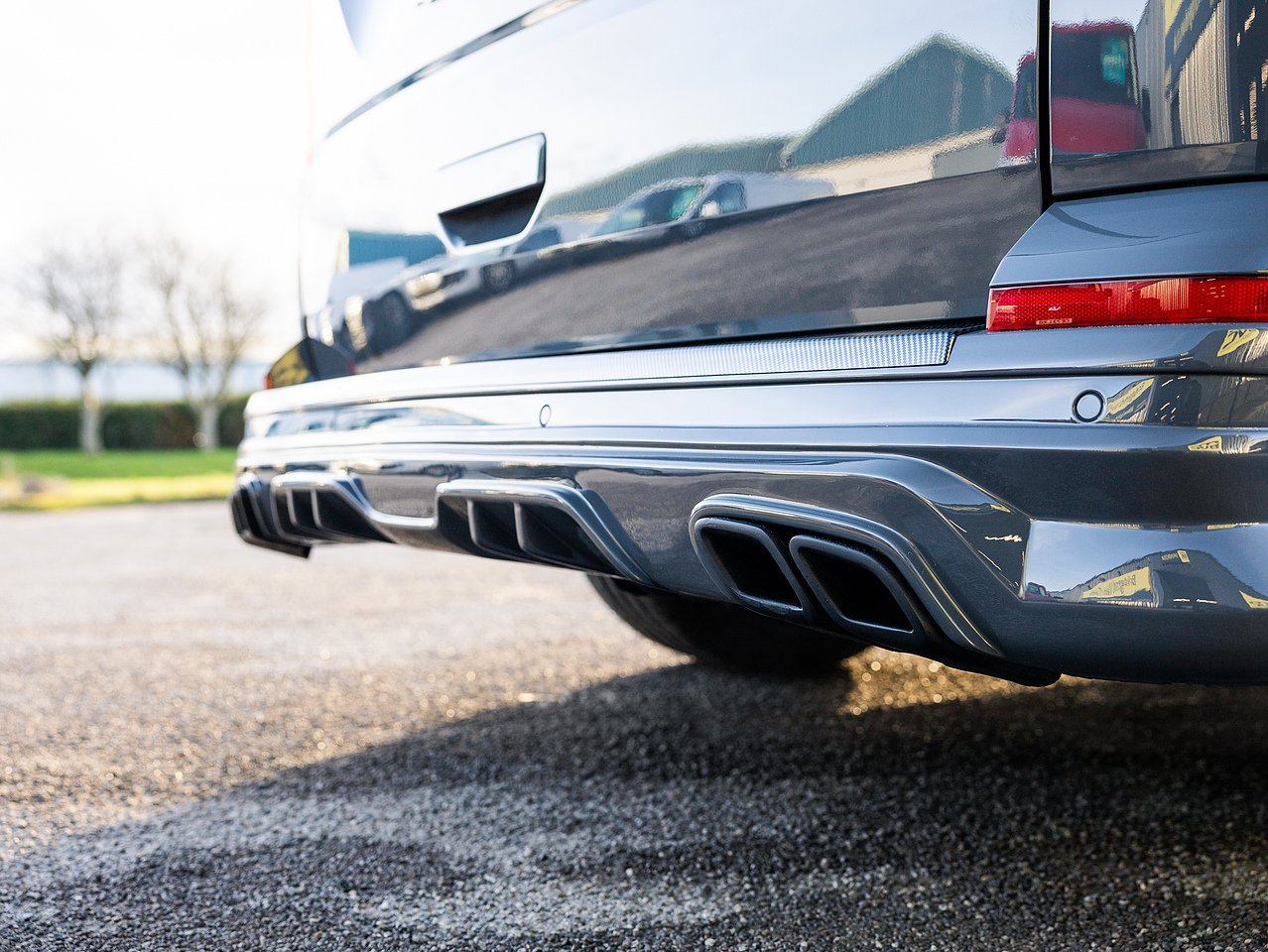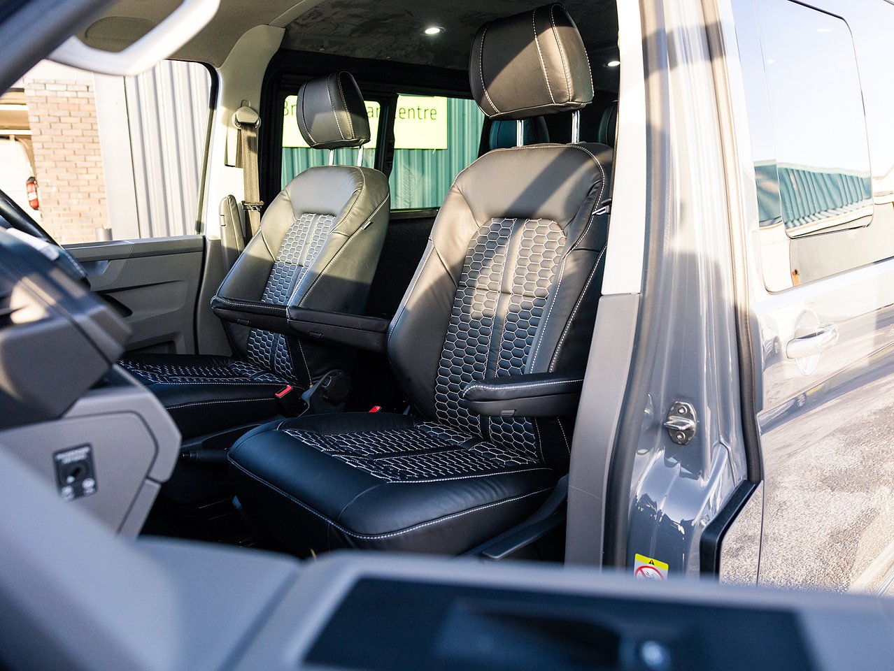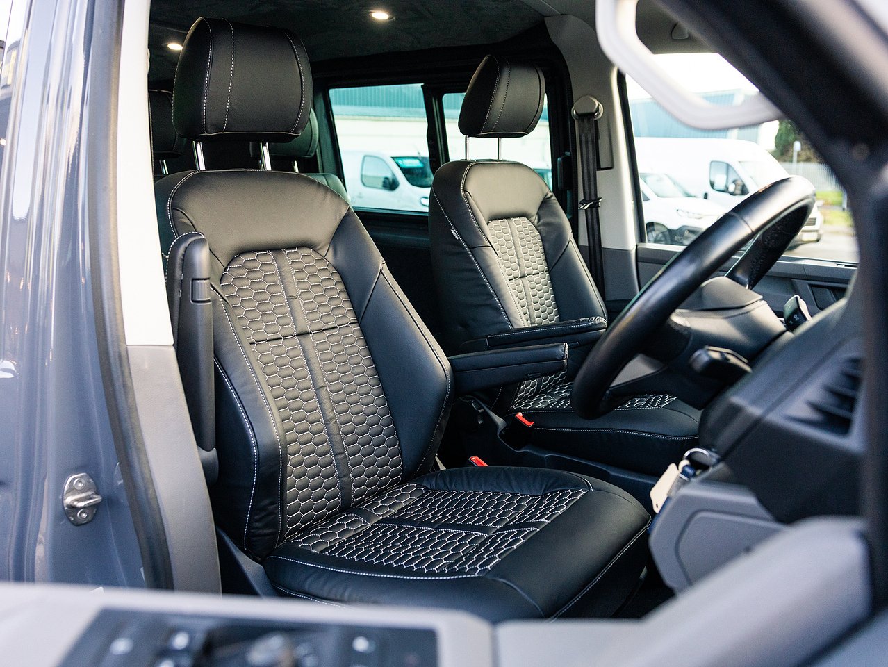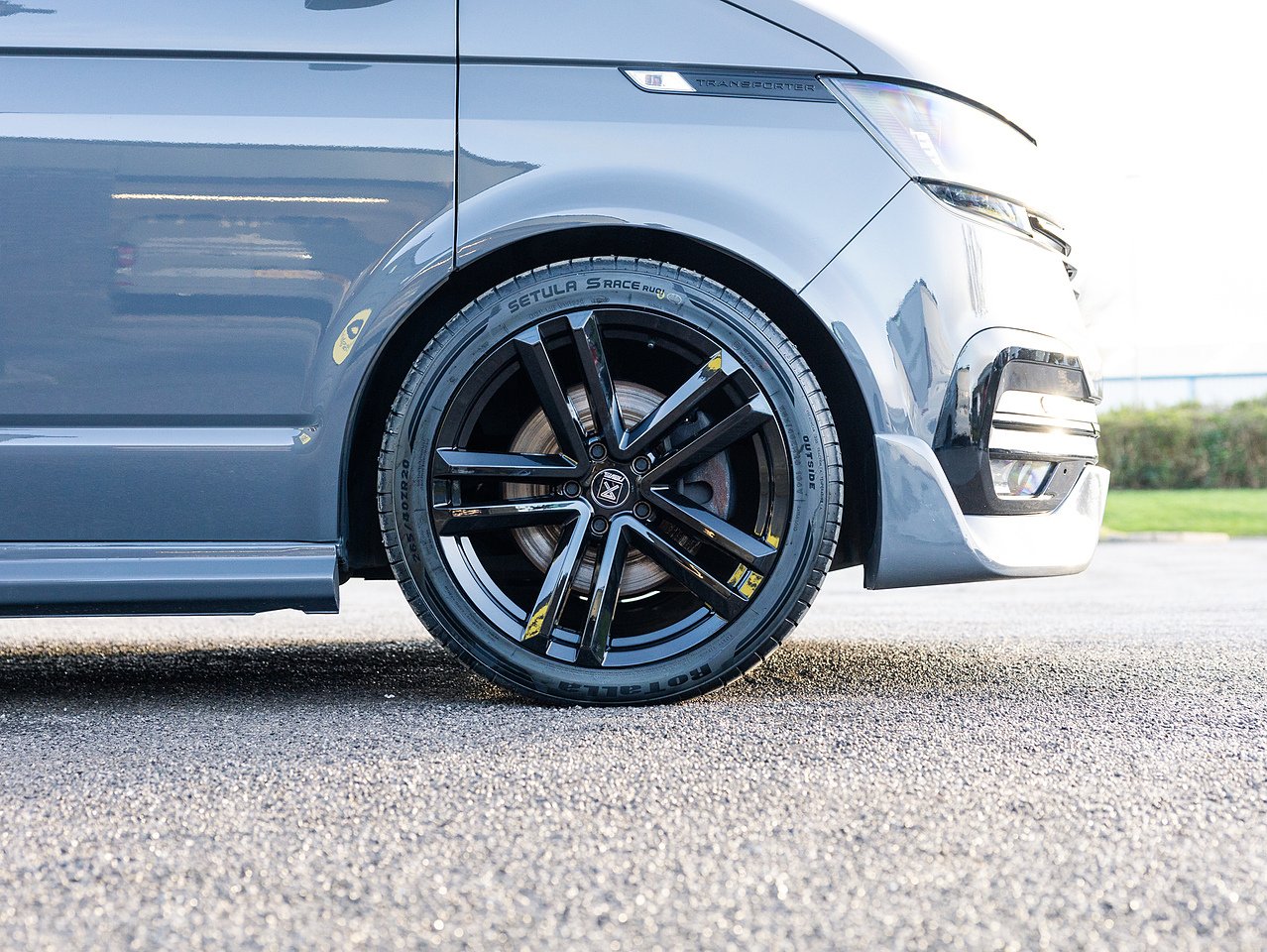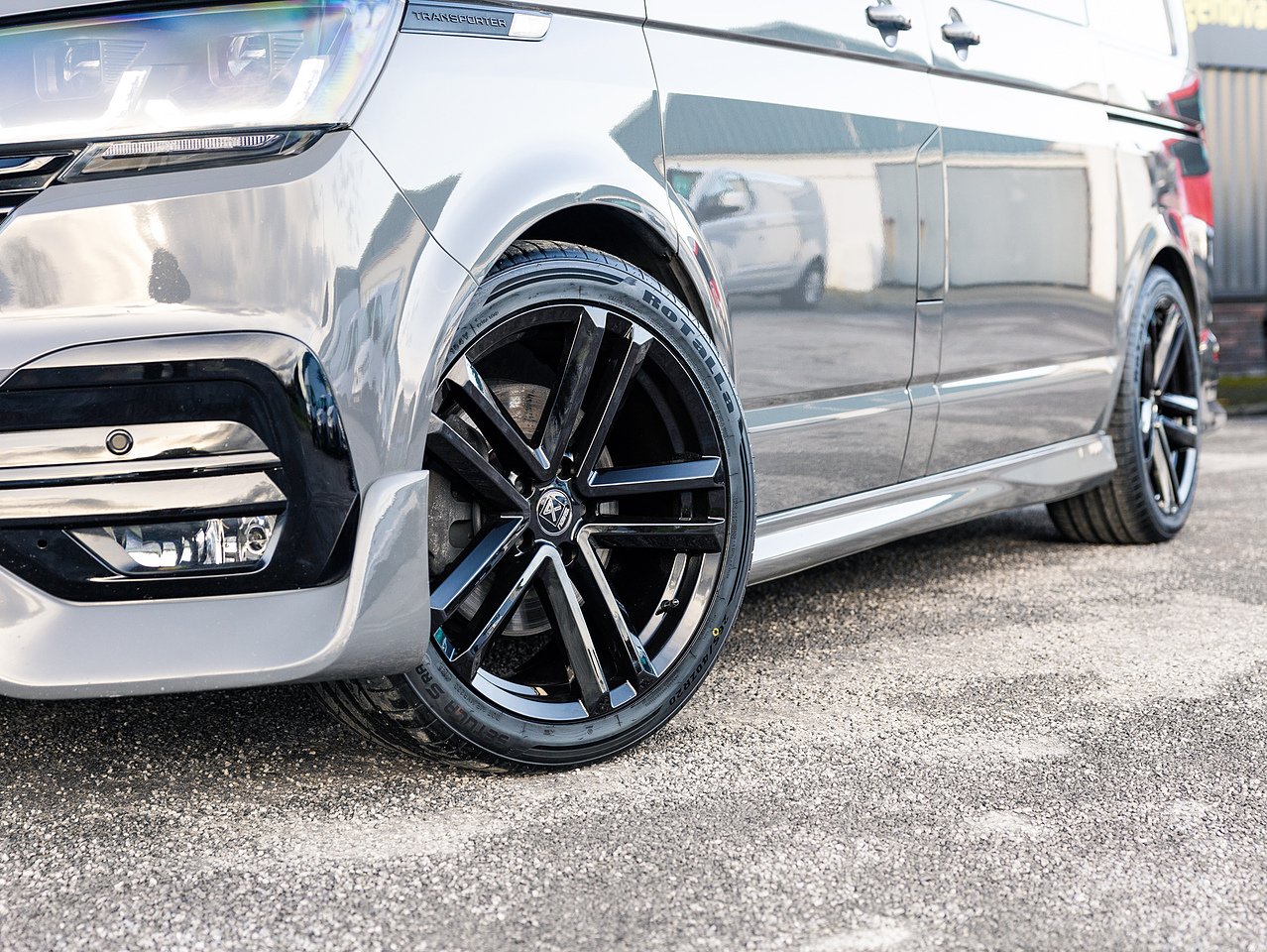 Styling upgrades include 20-inch gloss black Navis Twin-5 alloy wheels, 40mm lowering, carbon rear bumper protector, carpet lining with suede headlining, side skirts, roof bars, gloss black front grilles, front splitter, rear spoiler, rear diffuser, Transporter HQ headlight upgrade and a full black leather interior with contrasting hex-stitch and GTI front bolster upgrade giving this Transporter a distinctive, high-quality appearance.